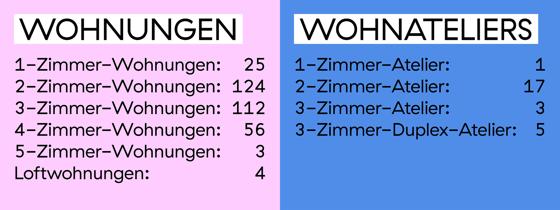 Neben klassischen Wohnungen mit 1.5 bis 5.5 Zimmern, entstehen im Lymhof Wohnateliers, Loftwohnungen und Maisonette-Wohnungen mit gemeinschaftlichem Dachgarten. Wie gross das Angebot pro Wohnungstyp ist, zeigt folgende Tabelle: